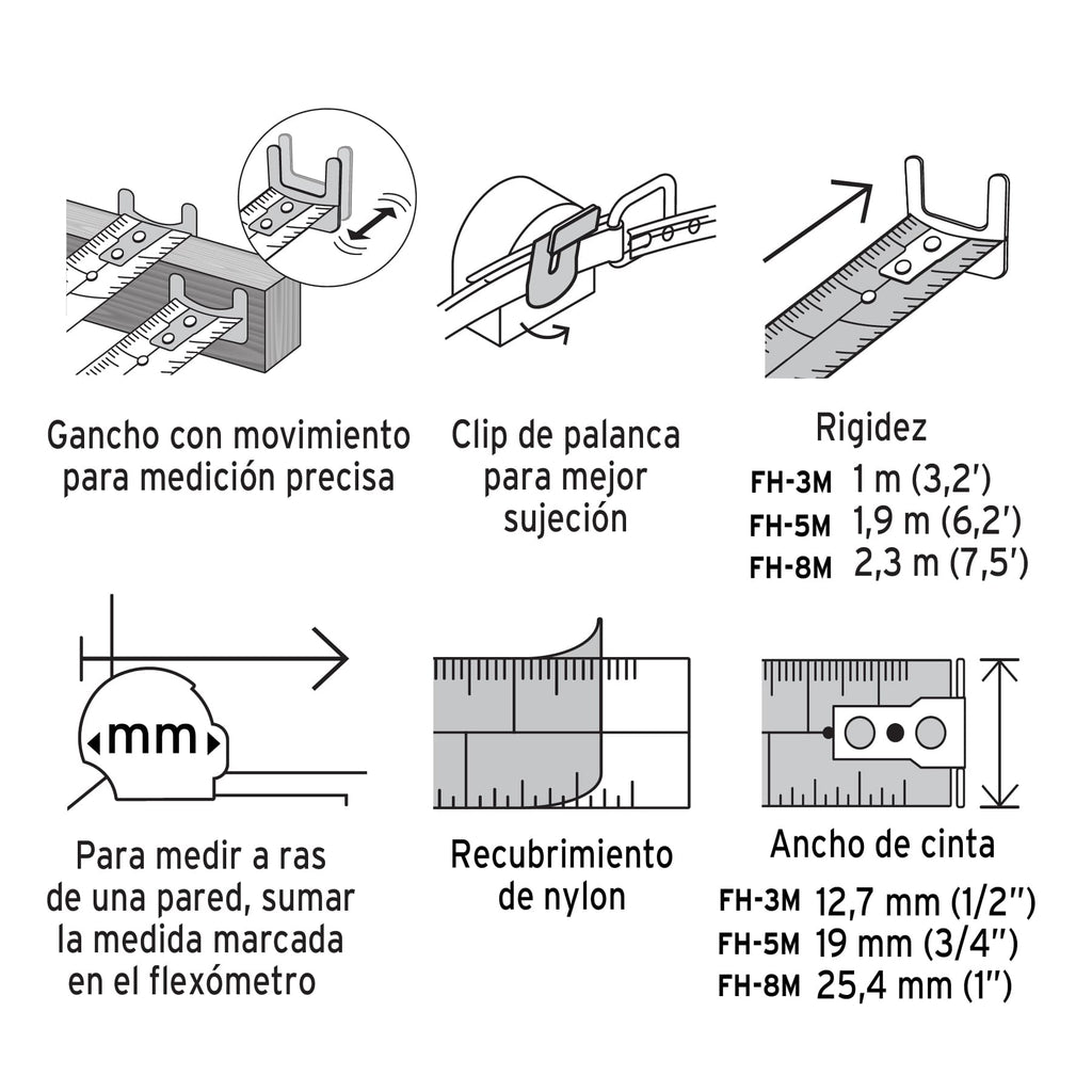 • Ganchos dobles que facilitan la medición por ambos lados (excepto FH-3M)