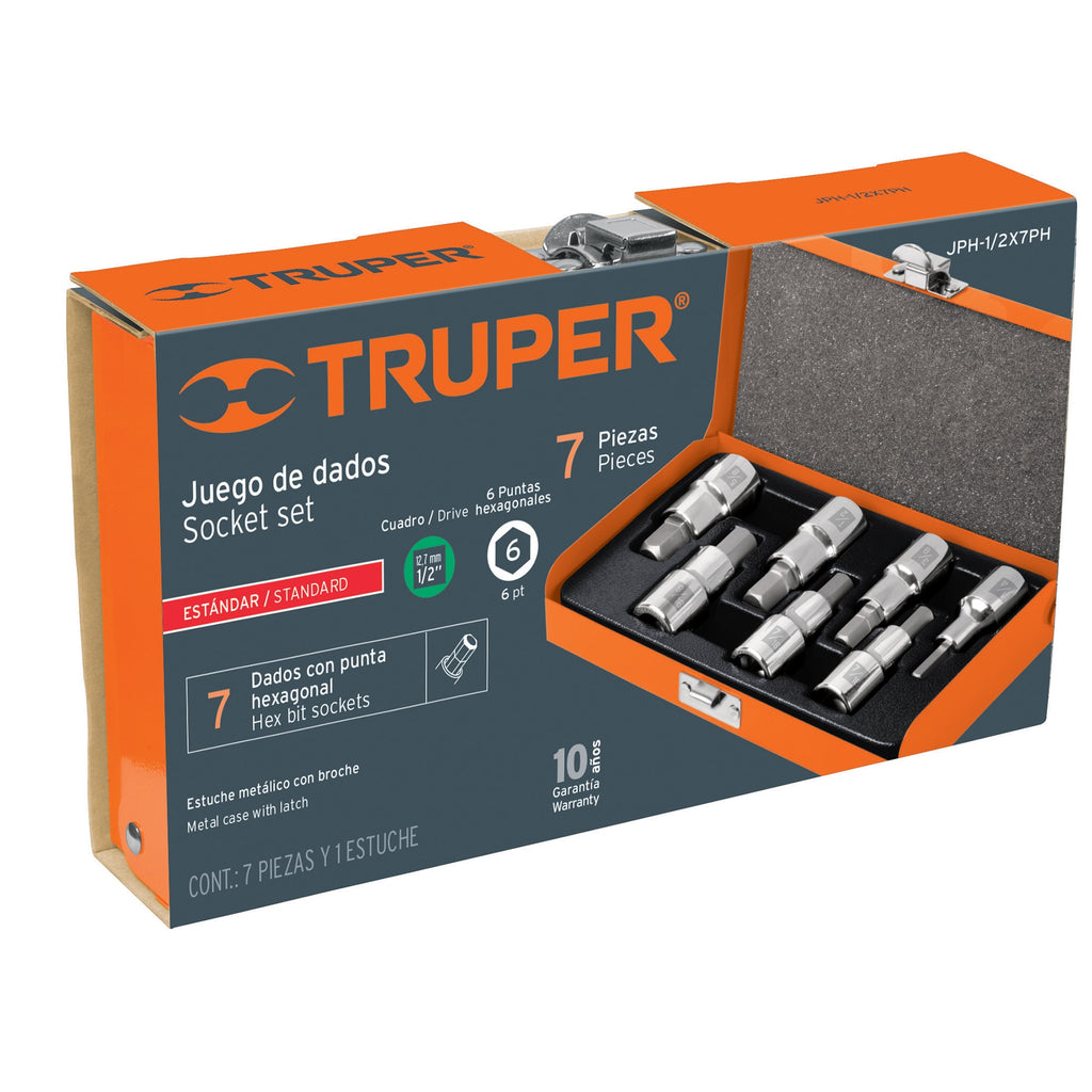 Juego dados punta hexagonal, cuadro 1/2', 7 piezas